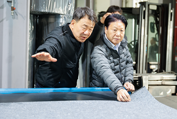 이병환 성주군수(오른쪽)가 지역 우수 업체를 현장 방문, 애로사항을 경청하고 있다 [사진=성주군]
