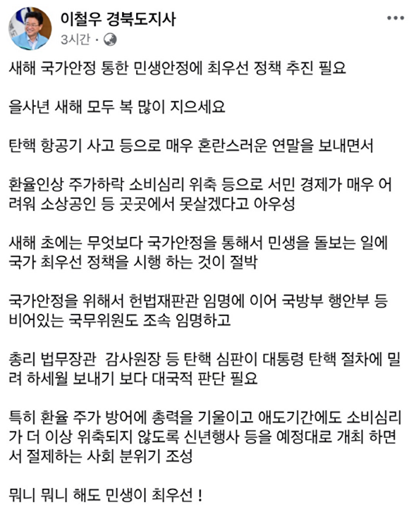 [아이뉴스24 이진우 기자] 이철우 경북도지사는 을사년 새해를 맞아 자신의 페이스북을 통해 민생 안정과 국가 안정을 최우선으로 삼는 정책 추진의 필요성을 강하게 피력했다.
