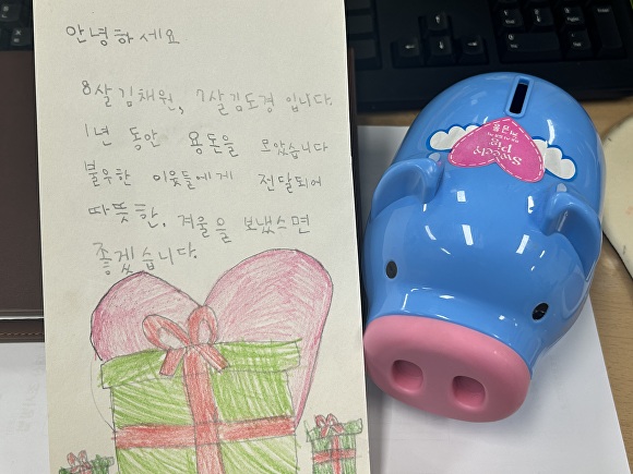 이날 두 남매가 가지고 온 돼지저금통 안에는 오만원짜리부터 십원짜리 동전까지 그동안 틈틈이 모은 14만원과 남매가 정성을 담아 쓴 그림편지가 들어있었다.