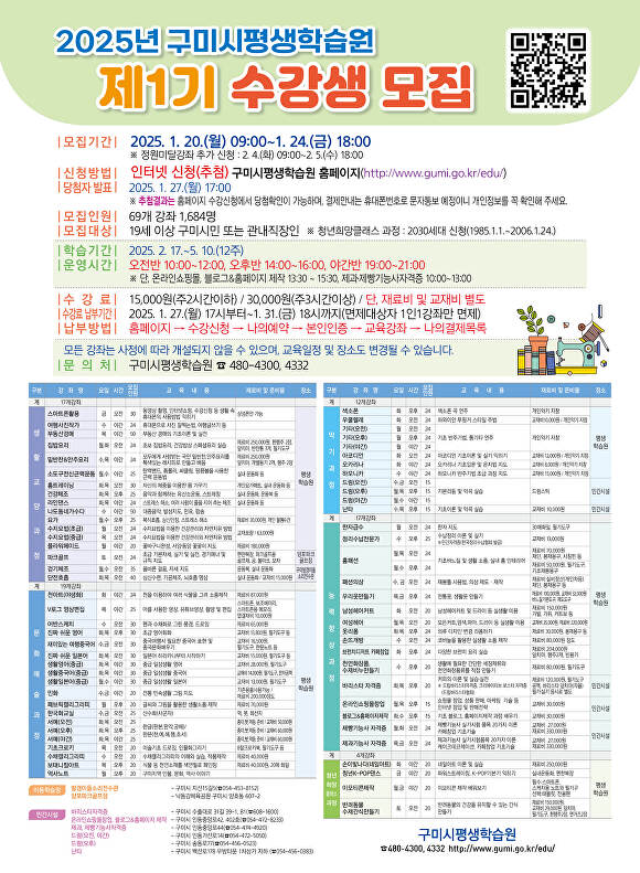[아이뉴스24 김철억 기자] 경북 구미시는 20일부터 24일까지 구미시평생학습원 홈페이지를 통해 2025년 제1기 정기과정 수강생을 모집한다.