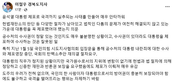 [아이뉴스24 이진우 기자] 이철우 경북도지사가 15일 자신의 페이스북을 통해 윤석열 대통령 체포와 관련된 입장을 밝히며, "국격까지 실추되는 사태를 만들어 매우 안타깝다"고 전했다.