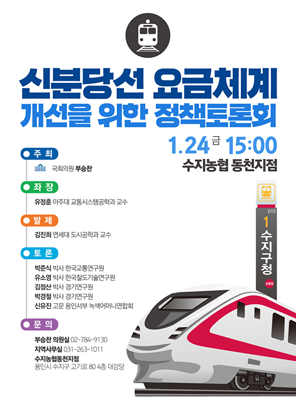 부 의원은 “수지구민에게 큰 부담이 되는 수도권 최고 수준 요금인 신분당선 요금 체계 개선을 위한 해결책을 모색할 수 있는 자리가 될 것”이라고 설명했다.
