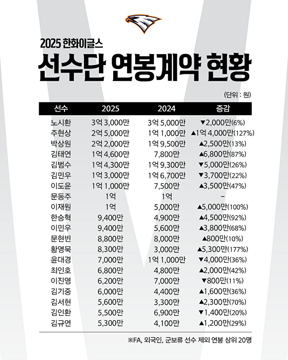 [아이뉴스24 안영록 기자] 한화이글스는 21일 2025년 재계약자 59명에 대한 연봉협상을 마쳤다고 밝혔다.