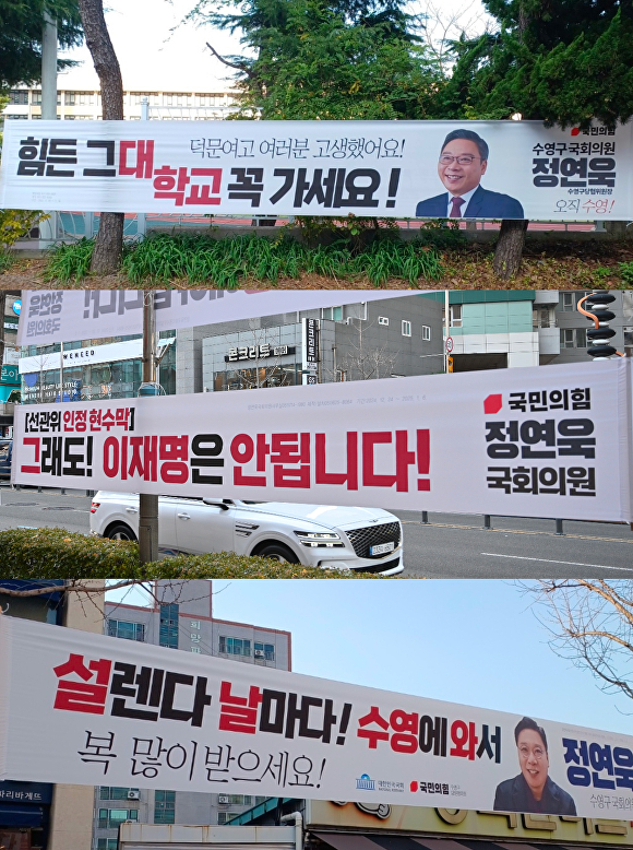 [아이뉴스24 정예진 기자] 정연욱 국민의힘 국회의원(부산 수영구)가 설 명절을 맞아 자신의 지역구 일대에 내건 현수막이 다시 한번 화제다.