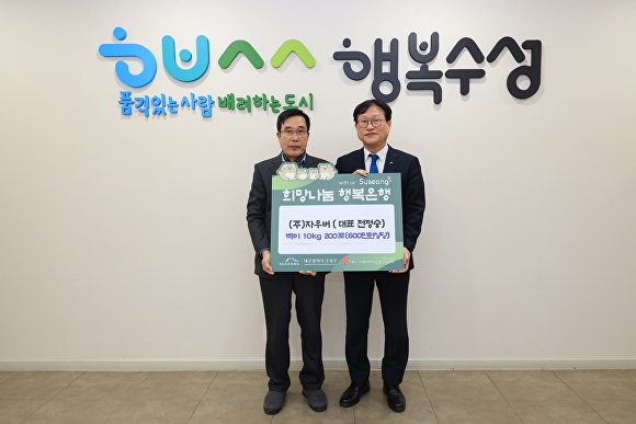[아이뉴스24 이창재 기자] ㈜자우버(대표 전정숭)는 지난 5일 지역의 어려운 이웃들을 돕기 위해 백미 10kg 200포(600만 원 상당)를 대구 수성구청에 기탁했다.