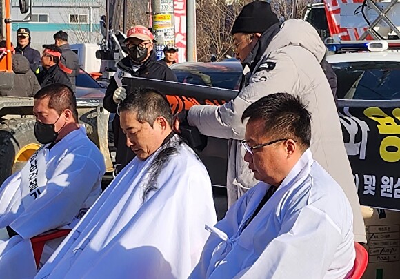 6일 용인특례시 처인구 원삼면사무소 사거리에서 반도체클러스터 일반산업단지 공사를 규탄하는 삭발식을 하고 있다. [사진=원삼면지역발전협의회]