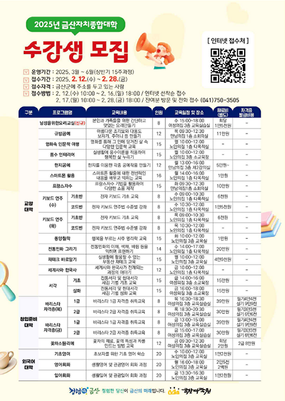 [아이뉴스24 박희석 기자] 충남 금산군은 오는 12일부터 28일까지 2025년 금산자치종합대학 수강생 315명을 모집한다.