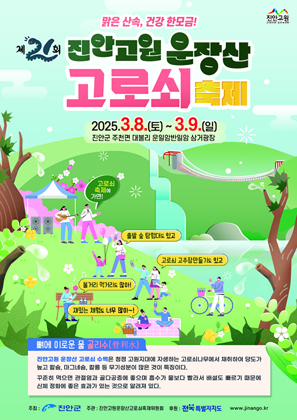 [아이뉴스24 박종수 기자] 전북자치도 진안군의 제21회 진안고원 운장산 고로쇠 축제가 3월 8일부터 9일까지 주천면 운일암반일암 삼거광장에서 개최된다.