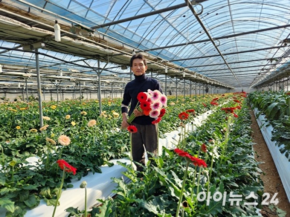박장춘 봉화군화훼협의회 회장이 거베라를 들고 기념촬영하고 있다. [사진=봉화군]