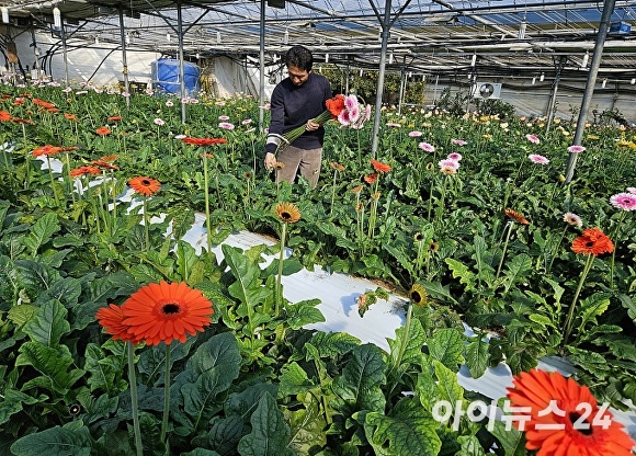 박장춘 봉화군화훼협의회 회장이 거베라를 수확하고 있다. [사진=봉화군]