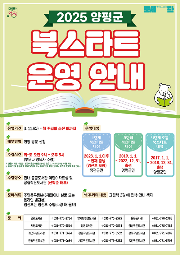 [아이뉴스24 이윤 기자] 경기도 양평군은 내달 11일부터 ‘2025년 북스타트 사업’을 시작한다고 밝혔다.