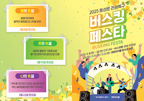 류규하 중구청장은 “이번 버스킹 페스타를 통해 동성로 관광특구를 방문하는 시민과 관광객들이 특별한 추억을 만들고, 동성로가 더욱 활기찬 문화 공간으로 자리 잡길 기대한다”며 “앞으로도 다양한 문화·관광 콘텐츠를 발굴해 지역경제 활성화와 동성로 관광특구의 매력을 널리 알릴 수 있도록 노력하겠다”고 말했다.