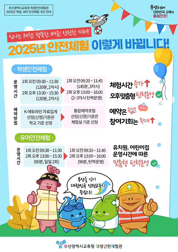 유아 안전체험은 유치원과 어린이집 운영시간에 맞춰 체험시간을 조정할 수 있도록 탄력적으로 운영한다. 또 부산시교육청 통합예약포털을 통해 보다 쉽고 간편한 예약서비스를 제공한다.