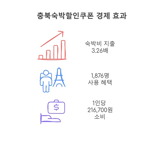 쿠폰 1000장 배포에 대한 숙박비 지출 효과는 약 3.26배, 충북 숙박 시 여행경비는 1인당 평균 21만6700원으로 나타났다.