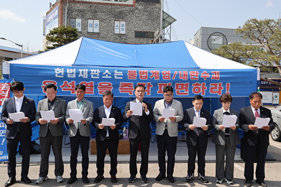 고창군의회는 이날 고창군청 천막 농성장 앞에서 헌법재판소의 '윤석열 대통령 탄핵심판 인용 결정'에 대해 환영의 뜻을 표하는 성명서를 발표했다.