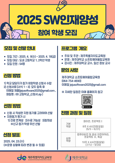 [아이뉴스24 배정화 기자] 제주특별자치도교육청(교육감 김광수)은 디지털·인공지능(AI) 역량을 갖춘 미래 인재 양성을 위해 ‘2025년 소프트웨어 인재 양성 프로그램’을 운영한다고 10일 밝혔다.