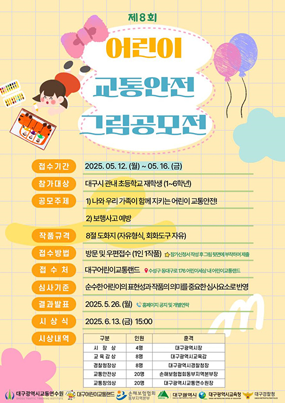 작품은 8절 도화지에 자유 형식으로 표현 가능하며, 참가신청서를 그림 뒷면에 부착해 대구어린이교통랜드로 방문 또는 우편 접수하면 된다.