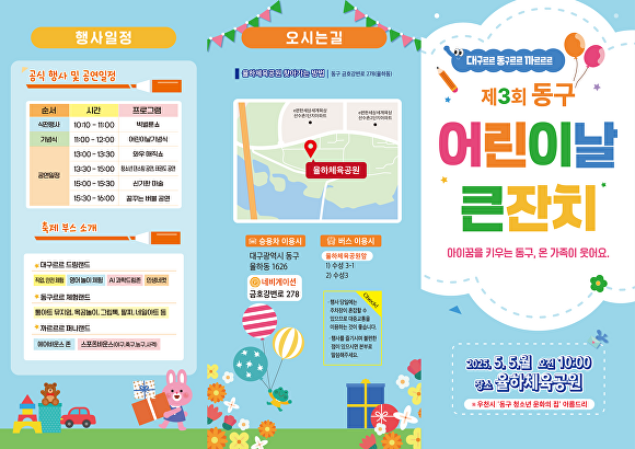 [아이뉴스24 이창재 기자] 대구 동구청(구청장 윤석준)은 오는 5월 5일 어린이날을 맞아 율하체육공원에서 ‘제3회 동구 어린이날 큰잔치’를 개최한다고 22일 밝혔다.