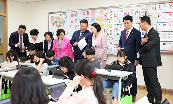 이날 손한국, 이영애, 이재화, 전경원 등 교육위원들은 3학년 수학, 4학년 영어 수업을 직접 참관하며 전통적인 서책형 교과서와 AI 디지털교과서가 어떻게 유기적으로 통합되어 수업에 적용되고 있는지를 면밀히 살폈다. 특히, 교사의 실시간 피드백과 학생 참여도 향상, 집중력 증대 등 긍정적인 효과에 주목했다.