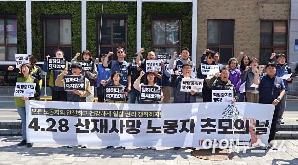 이 단체는 이날 충북도청 서문 앞에서 기자회견을 열고 “오늘은 국내에서 산재 노동자의 날이 국가기념일로 제정된 원년”이라며 “한국은 매년 2400여명의 노동자가 일터에서 숨지는 산재 공화국”이라고 주장했다.