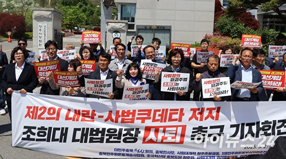 더민주충북혁신회의 등 12개 단체는 2일 청주지방법원 앞에서 기자회견을 열고 “정치 개입을 위한 무모한 졸속 판결은 사법부가 스스로가 개혁의 대상임을 증명한 것”이라며 “국민의 정치적 자유를 제한하고, 국민 위에 군림할 수 있다는 오만한 행위를 보였다”고 비판했다.