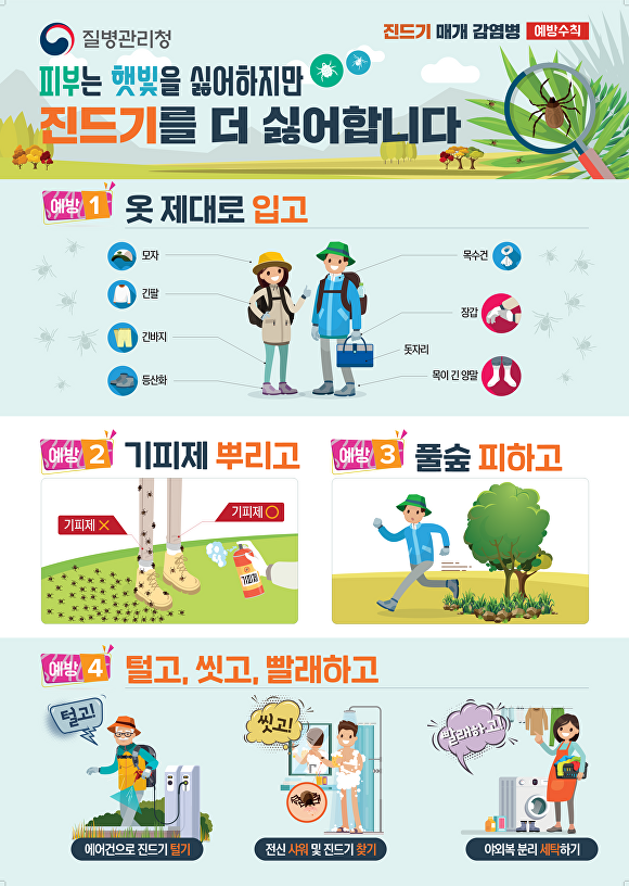 군 보건소는 주민들에게 △풀밭에 눕거나 앉지 않기 △피부 노출 최소화(팔토시, 장갑, 모자 착용) △야외활동 후 세탁과 목욕 철저 등을 당부하고 있다.
