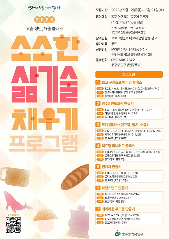 임택 동구청장은 “이번 프로그램은 청년들이 바쁜 일상 속에서도 자신만의 시간을 갖고, 실용적인 기술을 익히며 자기 개발과 사회 참여의 기회를 얻을 수 있도록 기획됐다”고 전했다.