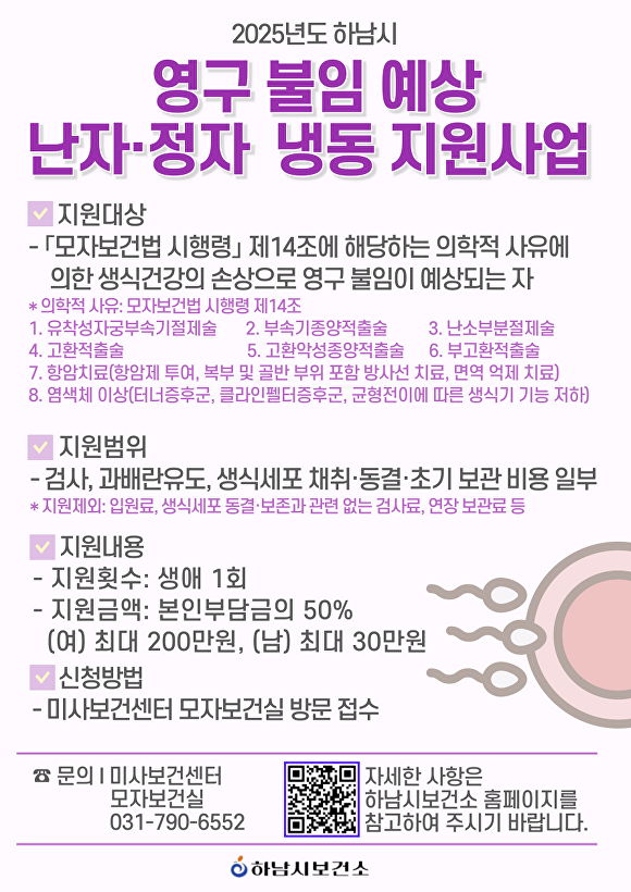[아이뉴스24 정재수 기자] 경기도 하남시는 ‘영구 불임 예상 난자·정자 냉동 지원사업’을 새롭게 시행한다고 9일 밝혔다.