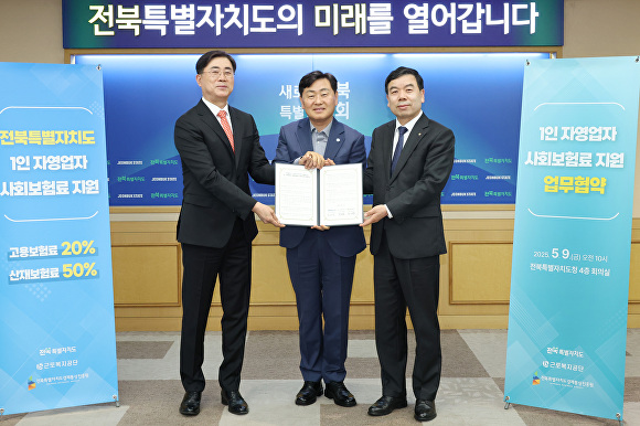 [아이뉴스24 김양근 기자] 전북특별자치도는 9일 도청에서 근로복지공단(이사장 박종길), 전북경제통상진흥원(원장 윤여봉)과 함께 ‘1인 자영업자 사회보험료 지원사업’의 원활한 추진을 위해 3자 업무협약을 체결했다.