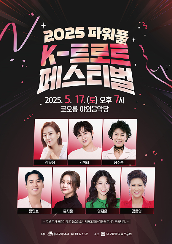 [아이뉴스24 이창재 기자] 대구광역시는 오는 17일 오후 7시, 코오롱야외음악당에서 ‘2025 파워풀 K-트로트 페스티벌’을 개최한다고 11일 밝혔다.