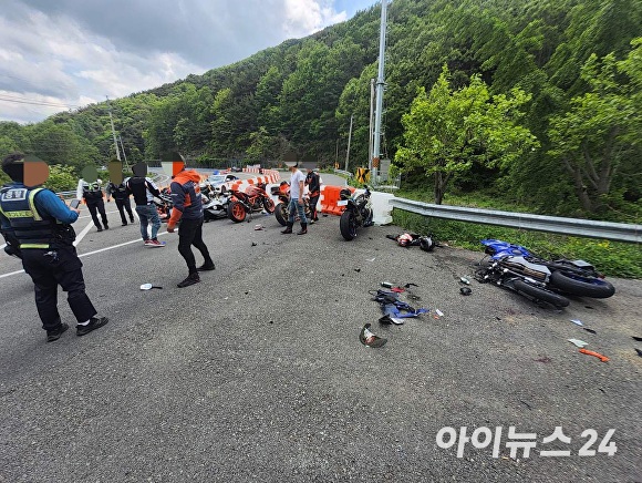 12일 오후 1시 41분쯤 청도군 운문면에서 주행 중이던 오토바이가 정차 중인 오토바이 7대를 추돌해 출동한 경찰이 사고 현장을 조사 중이다. [사진=경북소방본부]