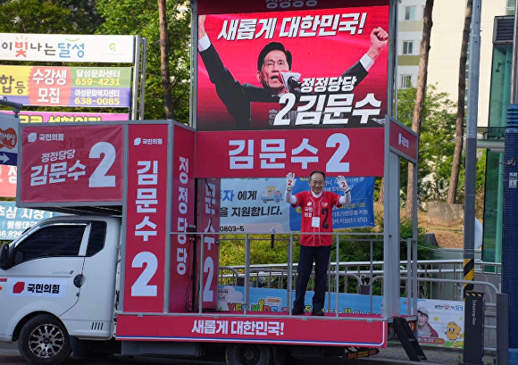 달성군의 추경호 의원은 지난 3.1절 광화문 집회 참여를 독려할 때 사용했던 차량을 급히 개조해 김문수 후보 홍보에 활용하며 운동원들과 함께 이날 아침 유세에 나섰다.
