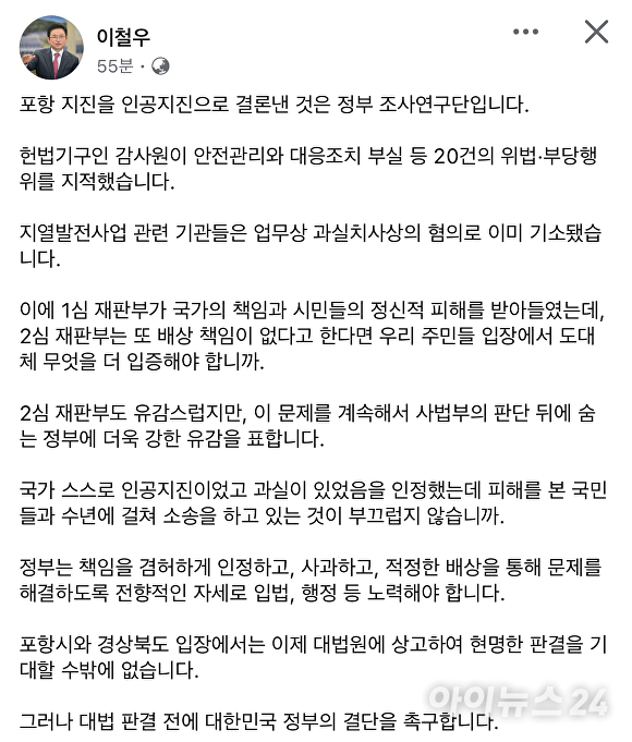 또한 이 지사는 "사법부의 판단 뒤에 계속 숨고 있는 정부의 태도가 더 큰 문제"라며 "국가 스스로 인공지진과 과실을 인정했음에도 피해를 본 국민들과 수년간 소송을 이어가는 것은 부끄러운 일"이라고 비판했다.