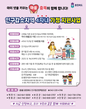 지원 대상은 도내 인구감소지역인 제천·보은·옥천·영동·괴산·단양에 거주하며, 자녀 4명 중 18세 이하 자녀 1명 이상이 주민등록상 동일 세대에 포함된 260가구다.