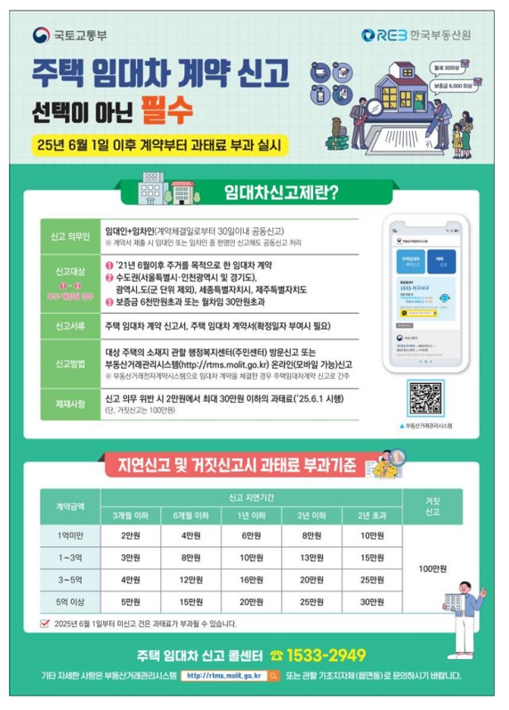 2021년 6월 1일부터 시행돼 계도기간으로 운영되던 제도는 오는 31일 종료되며, 6월 1일 이후 체결된 계약에 대해서는 신고 지연 시 최소 2만원에서 최대 30만원, 거짓 신고 시에는 최대 100만원의 과태료가 부과된다. 다만, 계도기간 중 체결된 계약에 대해서는 과태료가 면제된다.