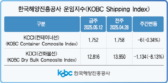 15일 한국해양진흥공사(KOBC·해진공)에 따르면 이번주 KCCI는 1752포인트로 지난달 28일 대비 0.3%(6포인트) 하락했다. 지난달 7일 11주 만에 하락세를 멈춘 뒤 반등했지만, 이후 다시 4주 연속 내림세를 기록 중이다. 다만, 하락폭은 0.5%에서 0.3%로 줄어들며 완화 조짐도 보였다.