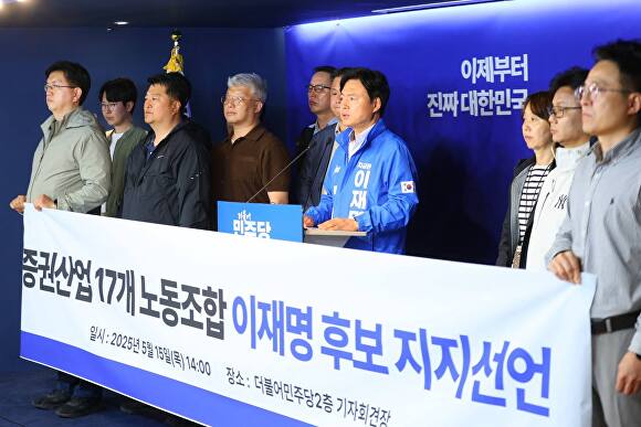 [아이뉴스24 임정규 기자] 증권산업 17개 노동조합이 15일 제21대 대통령 선거를 앞두고 이재명 더불어민주당 대통령 후보 지지를 공식 선언했다.