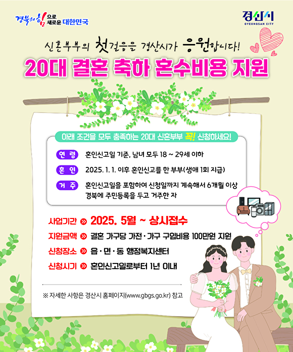 지원 대상은 혼인신고일 기준 부부 모두 18세에서 29세 이하이며, 경산시에 거주하는 신혼부부로, 혼인신고일을 포함해 최소 6개월 이상 경북도에 주민등록을 두고 거주 중이어야 한다.