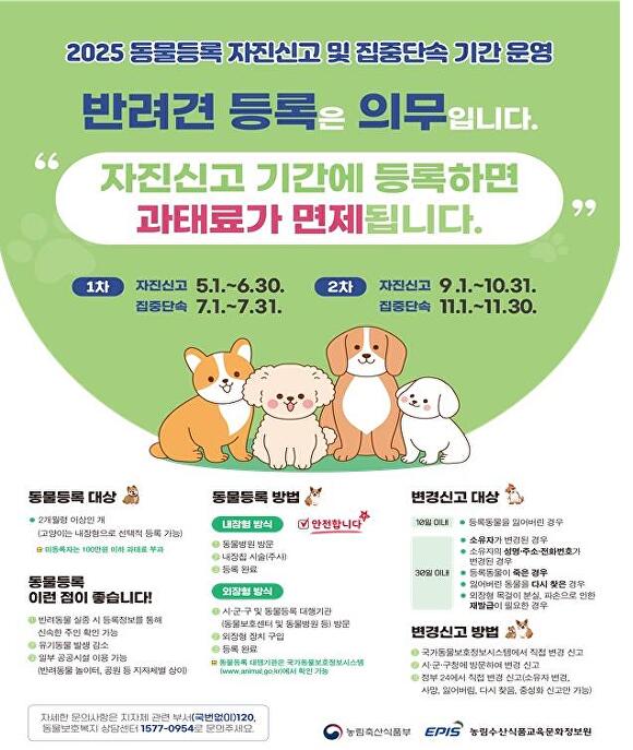 이상인 농업기술센터소장은 “반려동물등록은 단순 행정 절차가 아니라, 유기동물을 줄이고 반려동물의 생명을 보호하는 첫걸음”이라며 “자진신고 기간을 적극 활용해 성숙한 반려동물 문화에 동참해 달라”고 말했다.