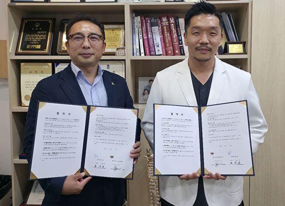 정민규 청주시야구소프트볼협회장과 염선규 청주필한방병원장(왼쪽부터)이 16일 상생발전을 위한 업무협약을 맺고 기념 사진을 찍고 있다. [사진=청주시야구소프트볼협회]