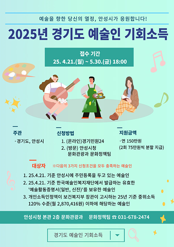 신청 자격은 올해 4월 21일 기준 안성시에 주민등록을 두고 있으며, 한국예술인복지재단에서 발급한 유효한 예술활동증명서를 소지한 예술인이다.