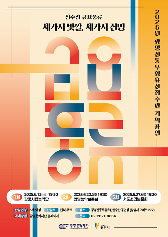 [아이뉴스24 정재수 기자] 광명문화재단이 올해 광명전통무형유산전수관 기획공연 '전수관 금요풍류-세가지 빛깔, 세가지 신명'을 다음 달 13일과 20일, 27일 오후 7시 30분에 광명전통무형유산전수관 공연장에서 선보인다.
