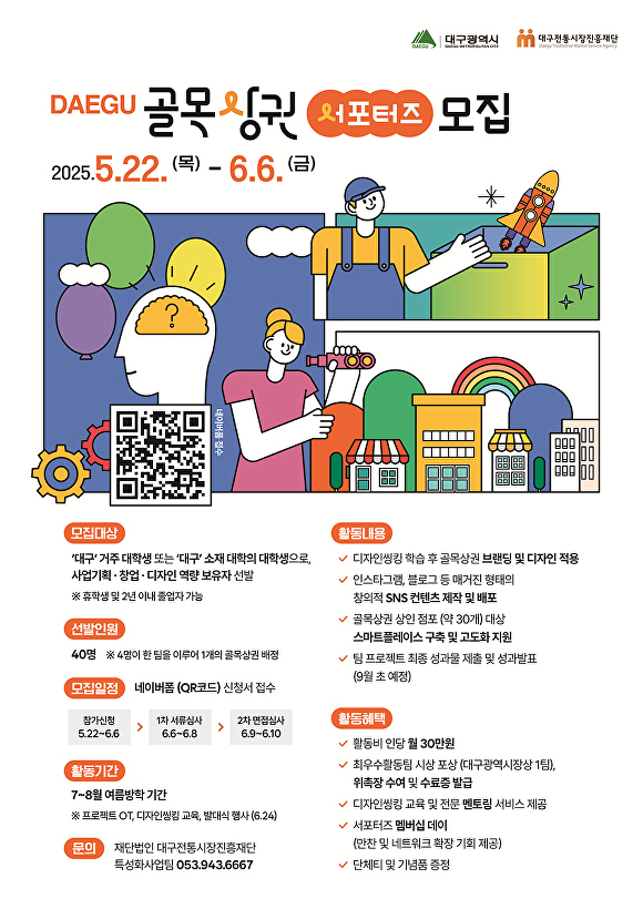 모집 기간은 22일부터 6월 6일까지고 대구시 또는 대구전통시장진흥재단 홈페이지, 포스터 QR코드를 통해 온라인으로 신청할 수 있다.