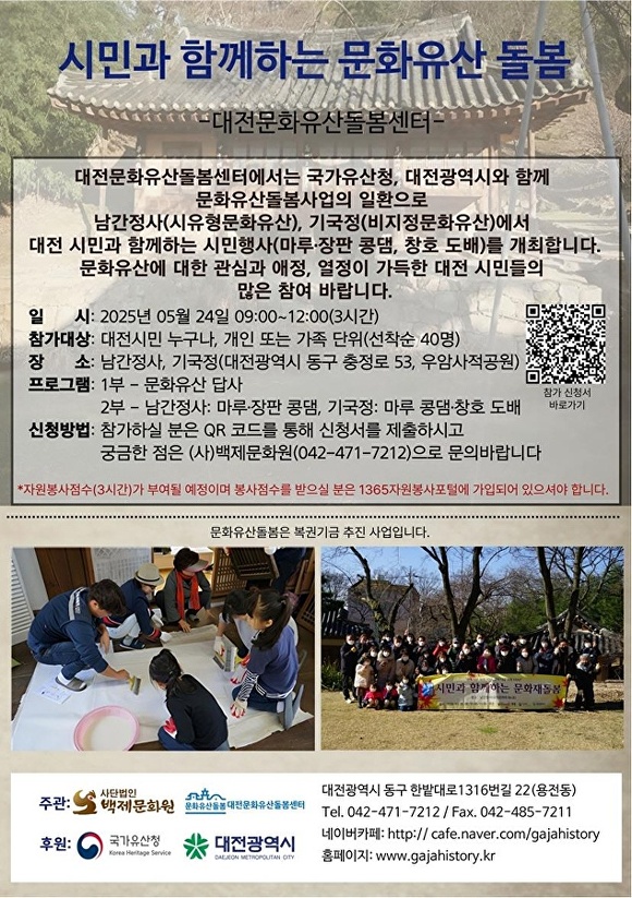 이번 행사는 대전문화유산돌봄센터가 주관하며, 지역 문화유산을 직접 가꾸고 체험할 수 있는 실천 중심의 시민 참여형 프로그램으로 진행된다.