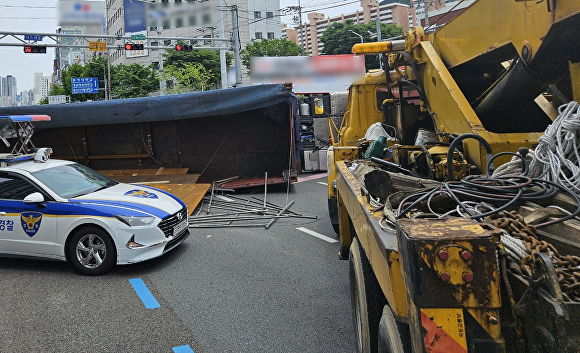 [아이뉴스24 박채오 기자] 21일 오전 11시 48분쯤 부산 사상구 주례동 주례교차로에서 트레일러 차량이 좌회전을 하다 전도되는 사고가 발생했다.