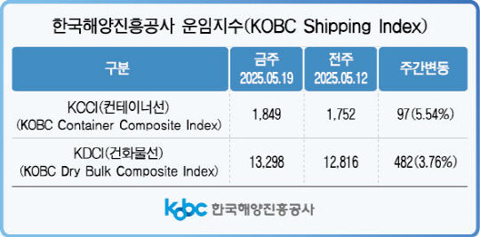 21일 한국해양진흥공사(KOBC)에 따르면 K-컨테이너 해상운임 종합지수(KCCI)는 전주 대비 5.5% 오른 1849포인트를 기록했다. 이는 지난 4월 중순 이후 5주 만의 반등이다.