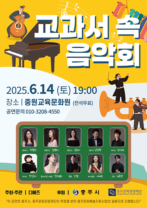 교과서 속 음악회는 전석 무료다. 디에즈 주최·주관으로, 충주시와 충주문화관광재단이 후원한다.