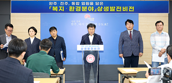 시와 완주·전주 상생발전 전주시민협의위원회(위원장 박진상)는 22일 시청 브리핑룸에서 진교훈 복지환경국장을 비롯한 담당 분야 간부공무원과 박진상 위원장 등이 참석한 가운데 ‘완주-전주 통합 염원을 담은 상생발전 비전’ 브리핑을 통해 복지분야 상생발전 비전을 제시했다.