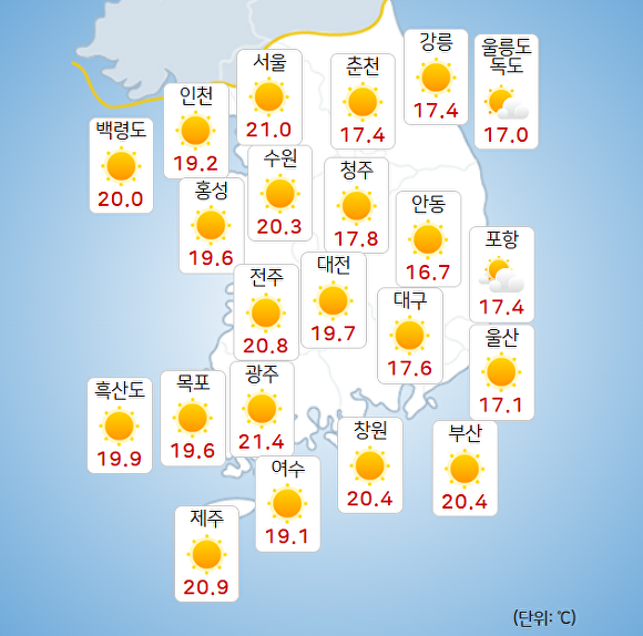 부산지방기상청에 따르면 이날 오전 9시 현재 주요 지역의 기온은 부산 20.4도, 울산 17.1도, 창원 20.4도로 기록됐다.