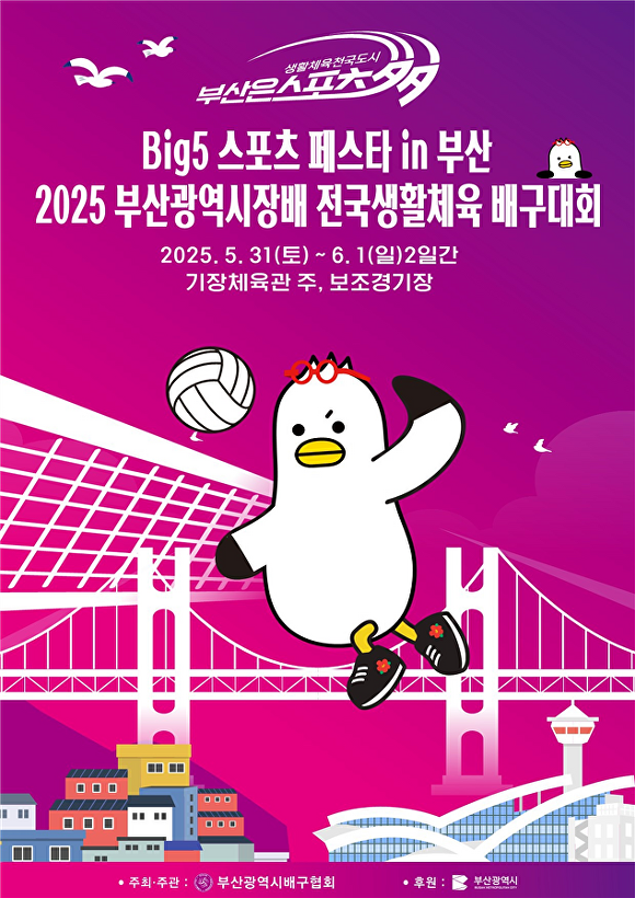 [아이뉴스24 정예진 기자] 부산광역시가 오는 31일부터 내달 1일까지 기장체육관에서 ‘BIG5 부산광역시장배 전국 생활체육 배구대회’를 개최한다.